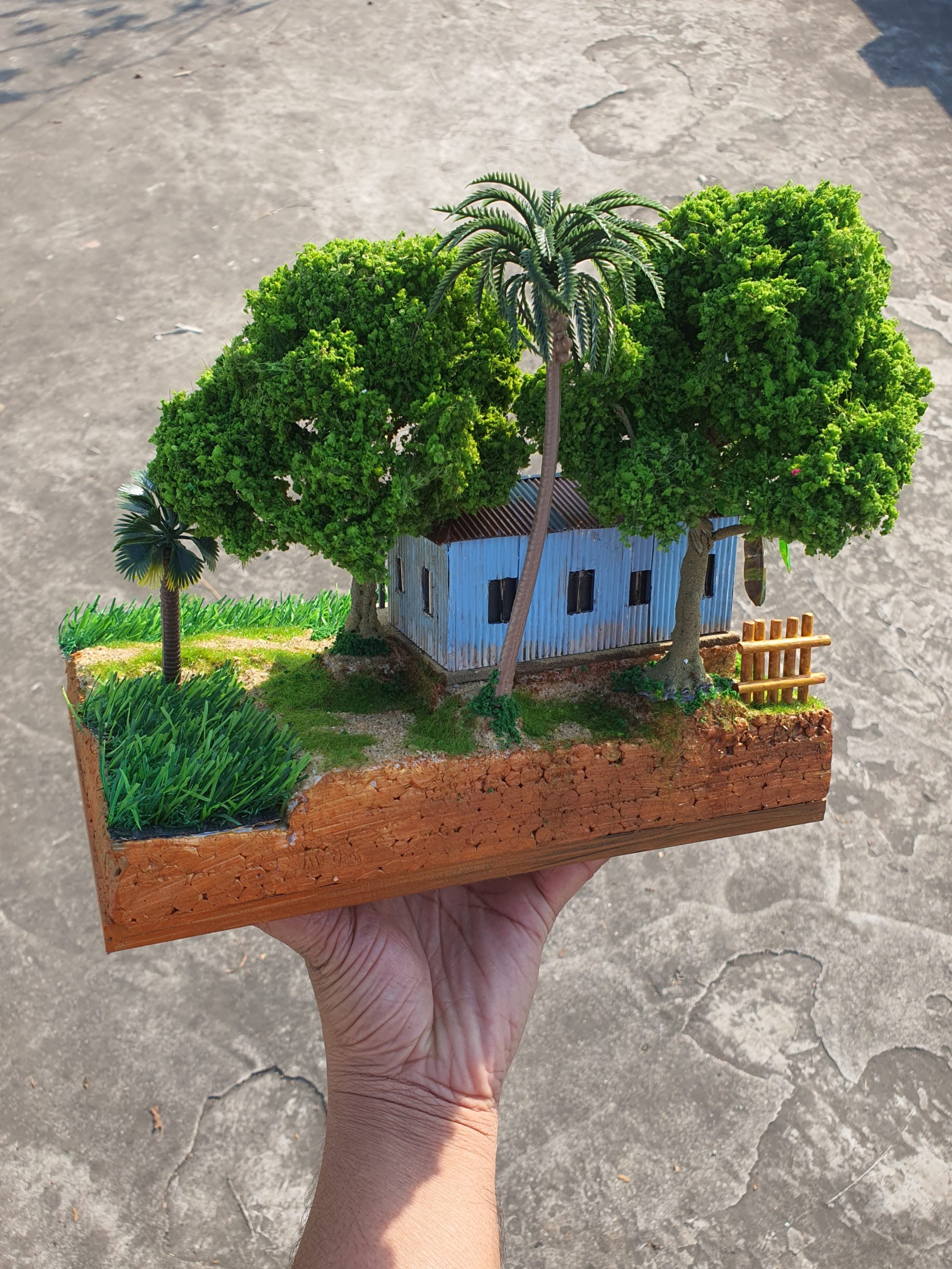 গ্রামীণ জীবন: মডেলটিতে ছোট ছোট ফিগার ব্যবহার করা হয়েছে—যেমন লাঙল কাঁধে কৃষক, কলসি কাঁখে বধূ কিংবা গাছের তলায় বিশ্রামরত রাখাল বালক। বাড়ির এক কোণে একটি ছোট গোলাঘর এবং গরু চড়ার দৃশ্যও যুক্ত করা হয়েছে।
